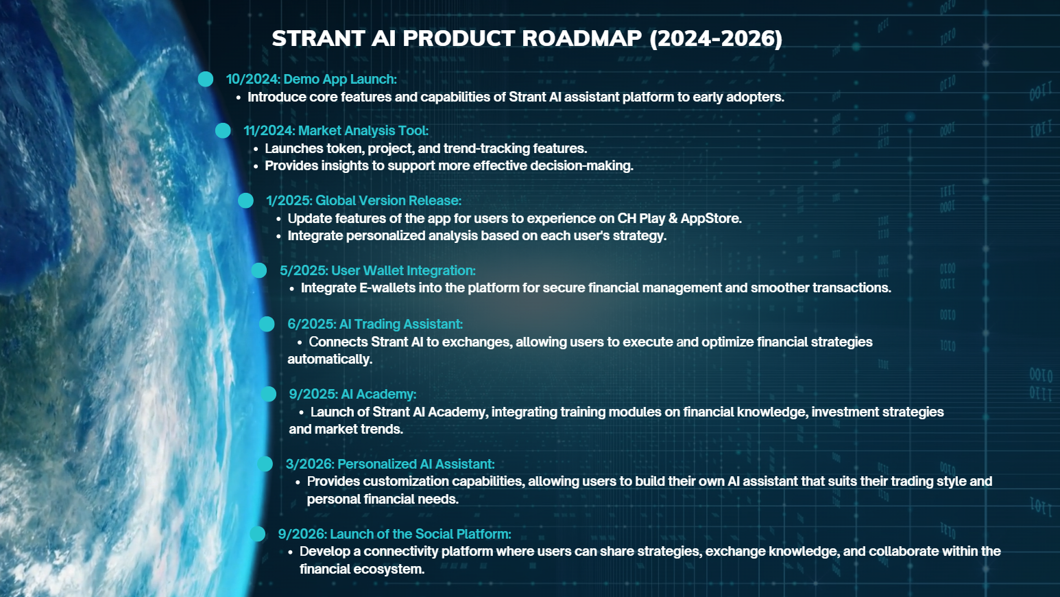 As Strant AI continues to innovate, its product roadmap for the next two years outlines several key milestones, each designed to enhance user experience and provide cutting-edge tools to support financial decision-making.